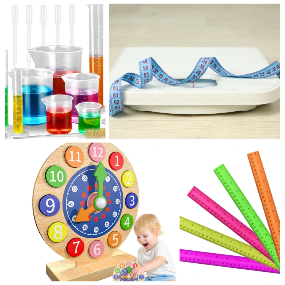 Ejemplos: Reglas, cintas métricas, balanzas, relojes didácticos, recipientes graduados.