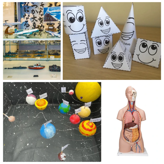 Ejemplos: Cuerpos geométricos, maquetas, figuras en 3D, modelos anatómicos simples.