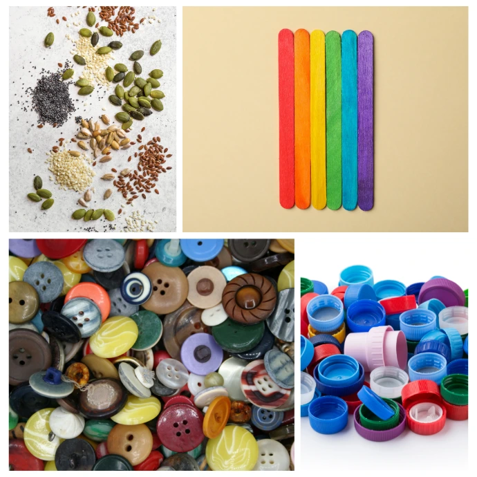 Ejemplos: Tapas de botellas, palitos de helado, piedras, semillas, botones.